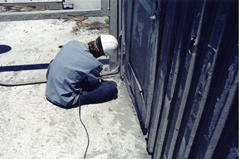 On top of the storage silos a large layer of cement built up over the years. This had to be removed before waterproofing the deck. Jackhammers were used on the larger pieces of cement and needle guns and grinders removed the material off of the roof deck, perimeter and equipment…a very expensive and time consuming process.