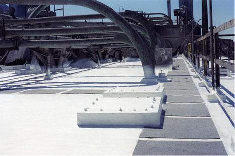 The original concrete deck was irregular. After the deck was primed, 6 gallons per 100 square feet of rubberized emulsion was applied to the roof deck followed by 1 layer of soft polyester. This process was repeated for a total of 2 layers. Using soft polyester allowed for the waterproofing system to mold to the concrete deck avoiding any air pockets or voids. A final coating of 6 gallons per 100 square feet of rubberized emulsion completed this phase of the job.