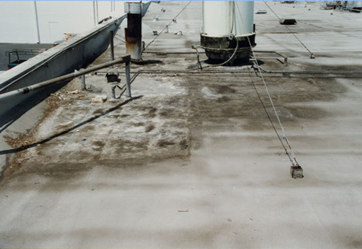 This 5-year old roof shows extreme damage from the leaking cooling tower.