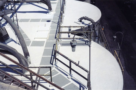 On top of the storage silos a large layer of cement built up over the years. This had to be removed before waterproofing the deck. Jackhammers were used on the larger pieces of cement and needle guns and grinders removed the material off of the roof deck, perimeter and equipment…a very expensive and time consuming process.