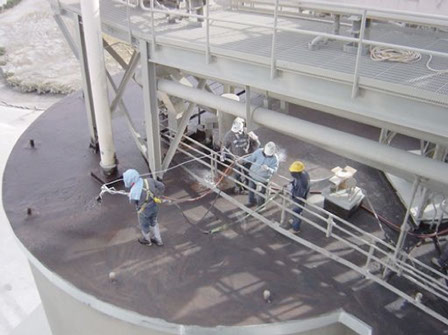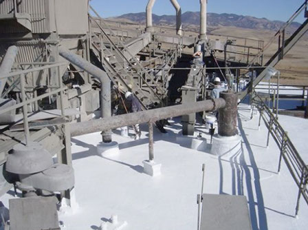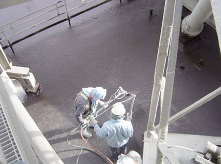 After priming the roof, emulsion and fiberglass roving are sprayed on to the roof to create a waterproof barrier.