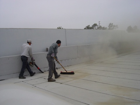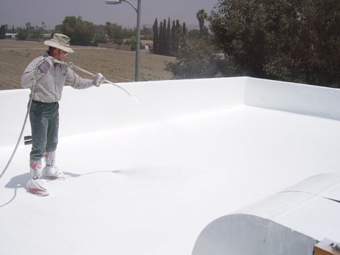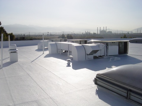 2 layers of Acu-Flex white coating are sprayed onto the roof. This will reduce temperatures and save money.