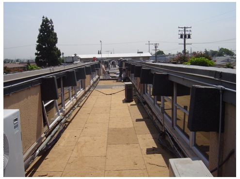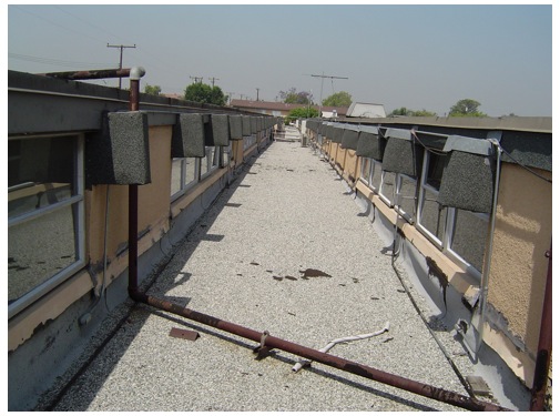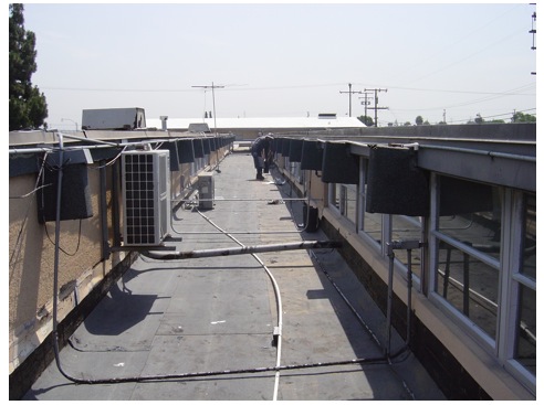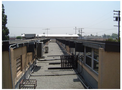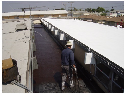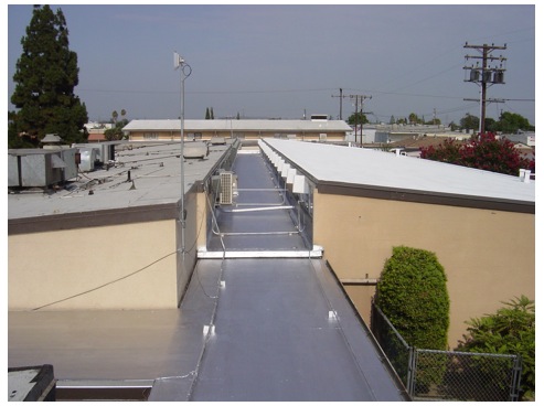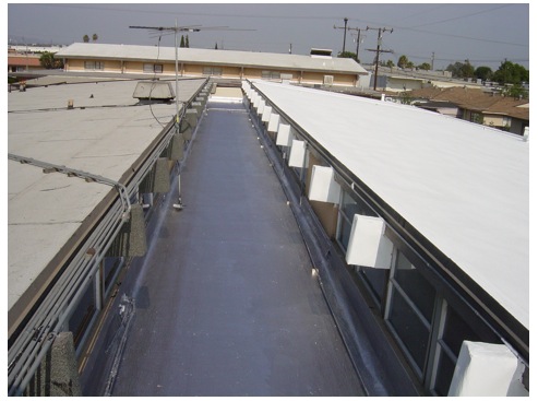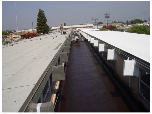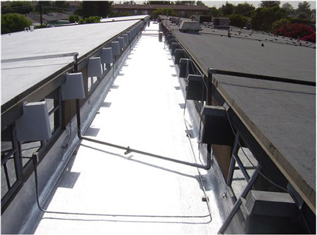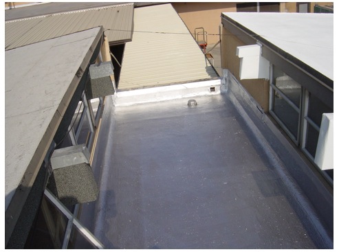 The finished roof. The upper roof was coated with a white elastomeric coating; the center section was coated with aluminum.