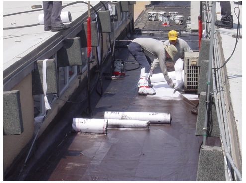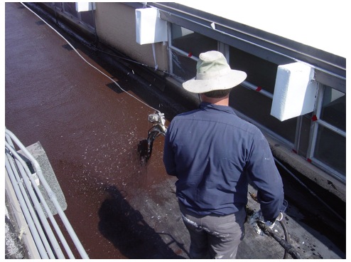 After the polyester was installed, we used a special high-pressure gun to apply 9 gallons of emulsion per 100 sq. feet while at the same time chopping up and shooting fiberglass into the mix. This provides one of the toughest waterproofing barriers available.
