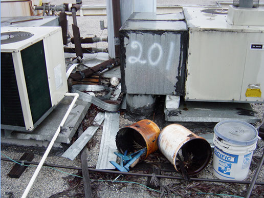 Heavy foot traffic to maintain roof top equipment, grease, improperly installed equipment all damage the roof. Neglect can hastily speed up the process for roof failure.
